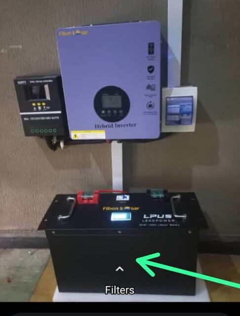 The image shows a Fibon Solar Lithium Battery. Brand: Fibon Solar. Model: Lpus. Technology: Lithium Iron Phosphate (LiFePO4). Features: Known for high efficiency, fast charging, and longer lifespan compared to traditional lead-acid batteries