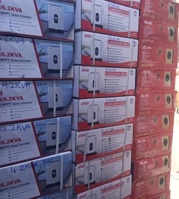 The image displays Sako brand hybrid solar inverters available in various capacities, commonly including 6.2KVA and 3KVA models.