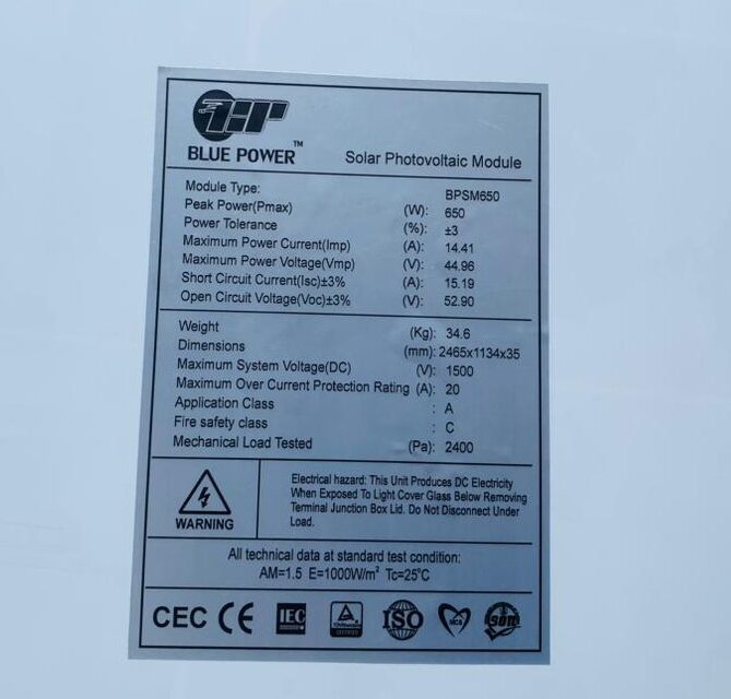 The Blue Power 650W Solar Panel is a high-capacity, monocrystalline solar module delivering 650 watts — ideal for homes or small businesses looking to reduce reliance on the grid. With 144 cells and rated voltage around 48 V, this panel is built for strong, stable energy output under Nigeria’s sunny conditions. Its robust manufacturing ensures durability and efficiency, making it suitable for both grid-tied and off-grid systems, especially when paired with a proper inverter and battery for uninterrupted power supply. Because of its power output, the panel can handle multiple household appliances, support lighting, fans, and even run small refrigerators. Installation typically involves standard mounting hardware and a compatible inverter, making setup relatively straightforward for solar installers in Lagos. Etc