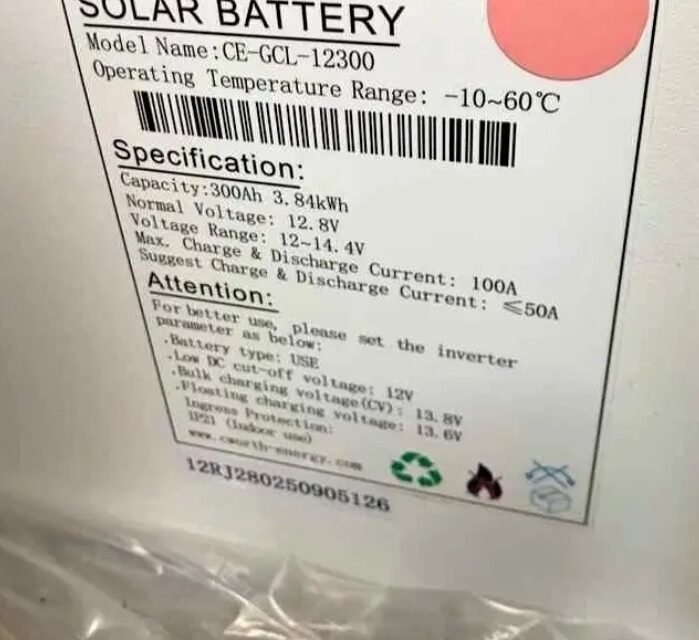 A 3.8 kWh, 300 Ah, 12 V battery is a high-capacity deep-cycle battery designed for solar power systems and inverter backup. At 300 Ah and 12 V, it stores about 3,800 watt-hours of energy — enough to run lights, fans, TVs, and small appliances during power outages or off-grid operation. These batteries commonly use LiFePO₄ (lithium iron phosphate) technology, which offers longer lifespan, lighter weight, faster charging, and better efficiency compared to traditional lead-acid batteries. They also have a Battery Management System (BMS) for improved safety, durability, and cycle performance, making them ideal for homes, offices, and small businesses. Quality units can be paralleled for larger systems and are suited for frequent daily cycling. Etc