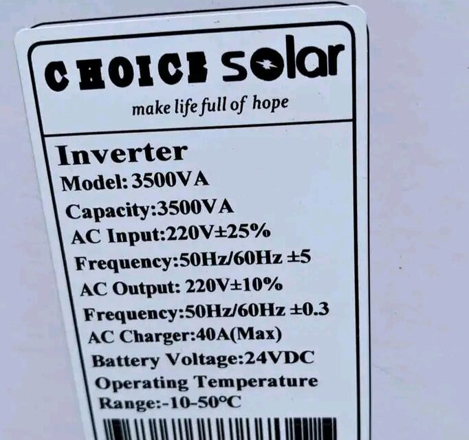 The Choice Solar Inverter 3.5 kVA, 24 V is a hybrid pure sine wave inverter designed for residential and small business solar systems. It can deliver up to ~3,500 VA (around 2.8 kW), making it suitable for powering lights, fans, refrigerators, TVs and small electronics. Operating on a 24 V battery bank, the unit supports charging via solar panels and grid or generator input. It features a multi-stage battery charger, LCD display for real-time system status, and protection against overload, short circuit, and over-temperature. Etc