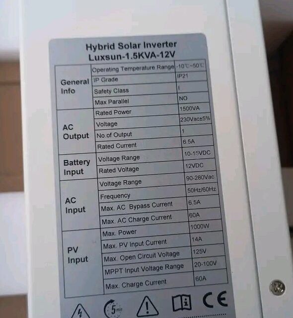 The Luxsun 1.5 kVA 12 V Hybrid Inverter is a compact, efficient inverter designed for homes and small offices in Nigeria. It delivers up to 1.5 kVA (≈ 1500 VA) of output power — enough for lights, fans, TVs, small appliances, and other moderate loads. It features a built-in MPPT solar charge controller (typically 60 A or 100 A), enabling it to charge batteries from solar panels efficiently while converting DC to stable AC power with pure sine wave output for sensitive electronics. The inverter accepts 12 V battery input and supports solar or mains (AC) input priority, and is compatible with different battery types (lithium, wet-cell, gel). It also offers protections against overload, over-temperature, and short circuits, with user-friendly LCD display and optional USB/RS232 ports for monitoring. This makes the inverter a reliable and relatively clean power backup/solar solution — ideal for frequent grid outages or solar-hybrid setups. Etc