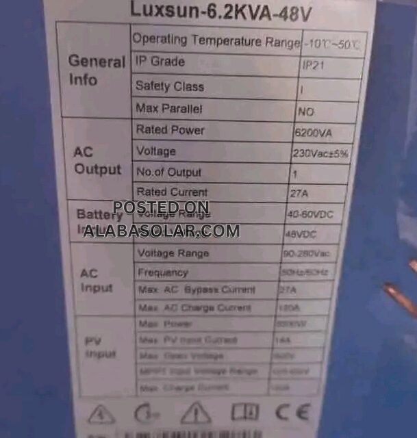 The LUXSUN Hybrid Inverter is a robust solar-and-grid power solution designed for Nigerian homes and small commercial setups. It features a pure-sine-wave output with power factor of 1, built-in MPPT solar charger plus an AC charger, configurable solar/AC input priority, and compatibility with generator backup. It supports various battery types (lead-acid, gel, lithium) and includes RS232/USB (or app) monitoring, over-load/over-temperature/short-circuit protections and inverter voltage ranges up to ~500 V DC for PV input. Ideal for ensuring uninterrupted power supply, it combines smart control with strong hardware in a hybrid setup. Etc