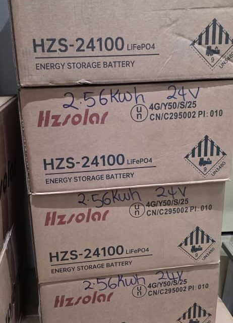 This item is a HZ Solar Lithium Battery, model HZS-24100, designed for energy storage systems. Capacity & Voltage: 2.56kWh and 24V. Technology: Lithium Iron Phosphate (LiFePO4).